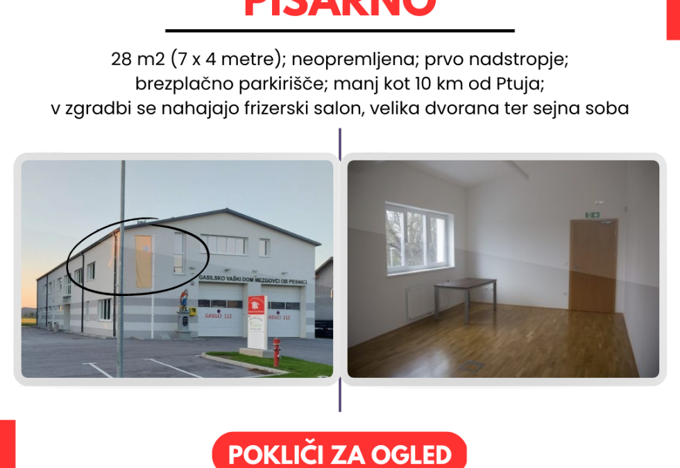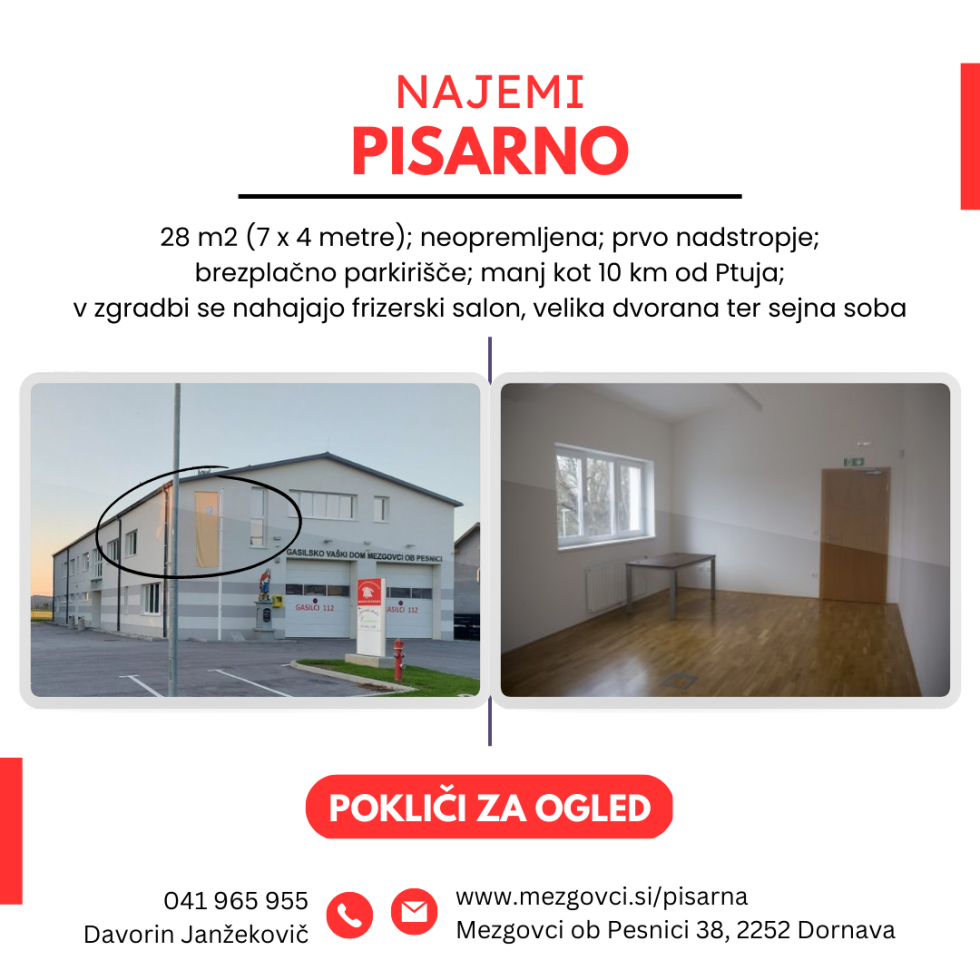 Pisarna v izmeri 28 m2 (7m x 4m) se nahaja v prvem nadstropju gasilsko vaškega doma. Pisarna je prazna (neopremljena). Pisarno je mogoče samostojno urediti/preurediti po željah najemojemalca. Skupne sanitarije za celoten objekt.